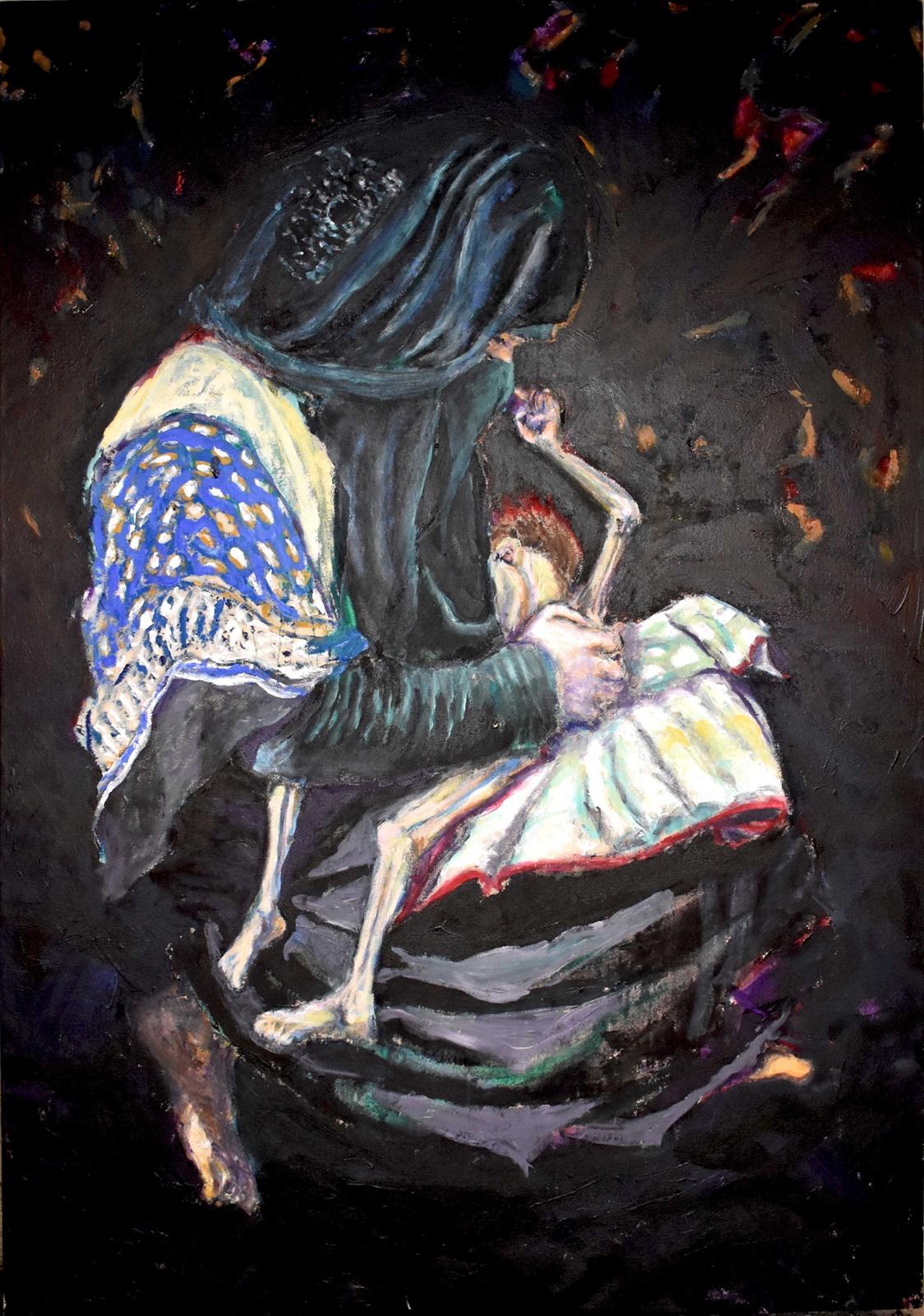 من الوهلة الأولى، تفرض اللوحة على المشاهد حالة من السكون العميق الممزوج بالانقباض؛ فاللون الأسود يهيمن على الخلفية بشكل كاسح، وكأن العدم يبتلع المكان والزمان معًا. حرر لوحته من بيئة محددة، وجعلها في شكل تفاصيل مشهدية مشتتة؛ مما يدفع كل تركيزنا لينساق نحو مركز اللوحة: الأم والطفل.