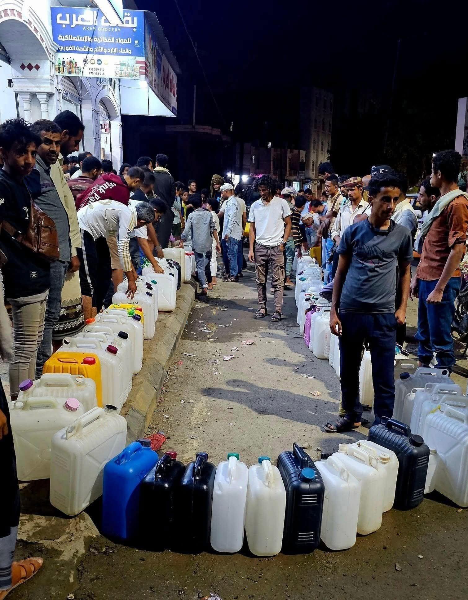 يصطف سكان مدينة تعز في طوابير طويلة أمام خزانات مياه الشرب التي وفّرتها في الحارات جمعيات ومنظمات وشركات، غير أن الأسرة الواحدة لا تحصل على أكثر من 40 لترًا من المياه الصالحة للشرب كل أسبوع.