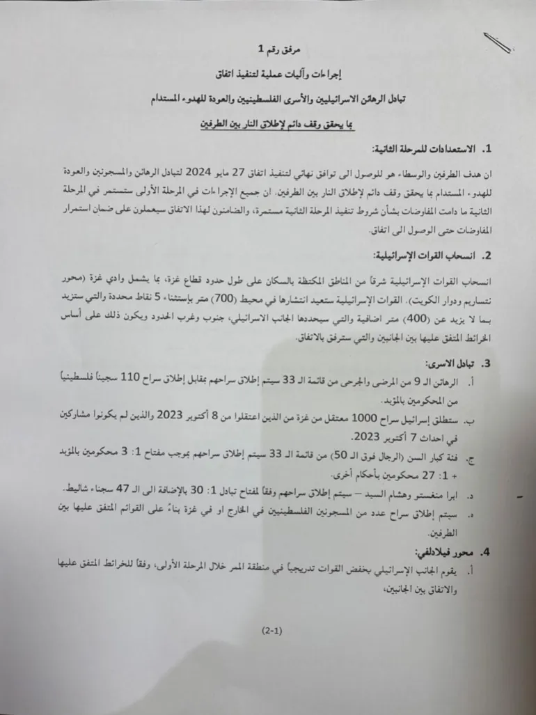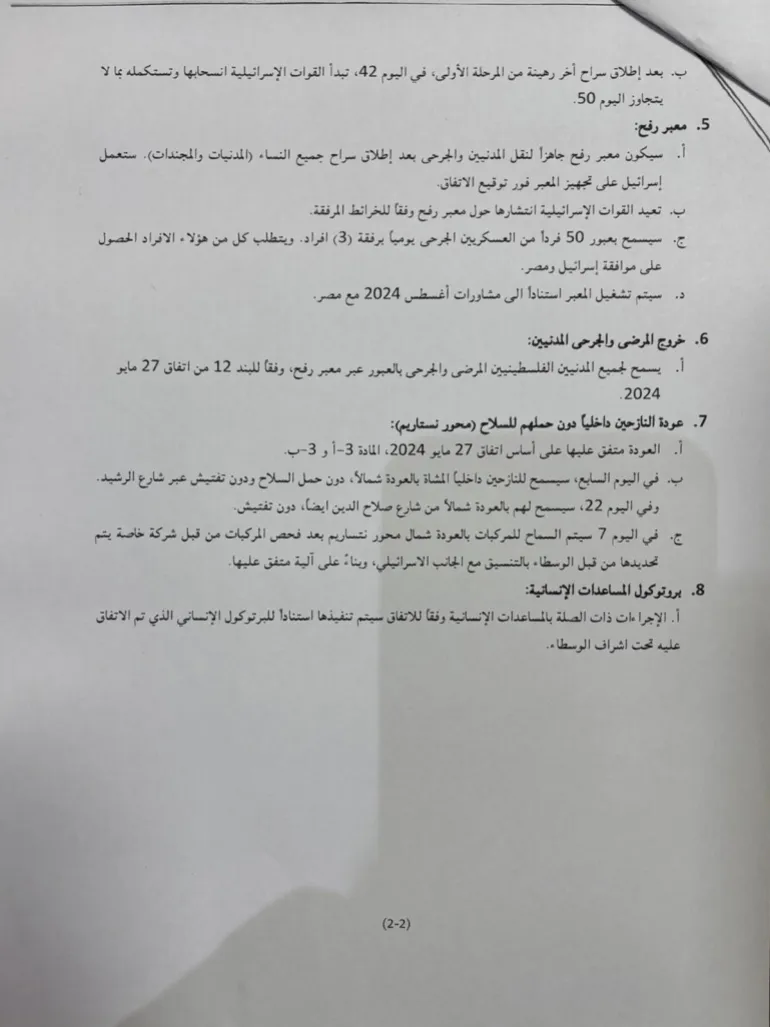 ويشمل الاتفاق تشكيل لجنة مصرية قطرية تشرف على عودة النازحين من جنوب القطاع إلى شماله، على ان يكون الانسحاب الإسرائيلي من محور نتساريم على مراحل، اضافة الى انسحابه من المناطق السكنية إلى حدود غزة بعمق 700 متر.