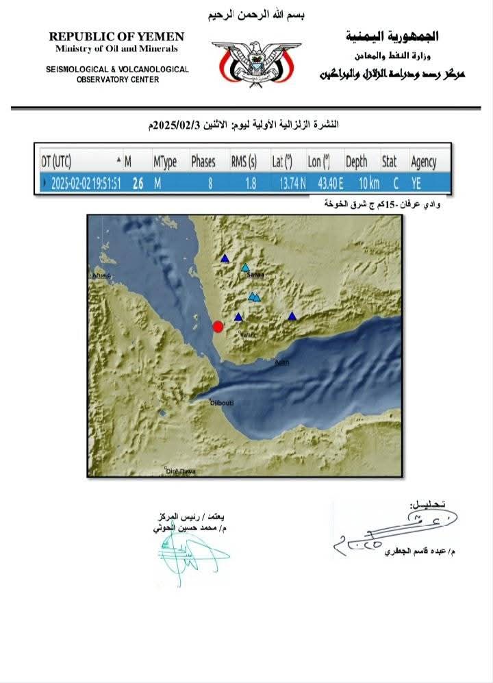 وبحسب النشرة الزلزالية الصادرة عن المركز الاثنين 3 فبرائر/شباط 2025 سجلت الهزة في وادي عرفان على بعد 15 كم جنوب شرق الخوخة بمحافظة الحديدة، غرب اليمن.