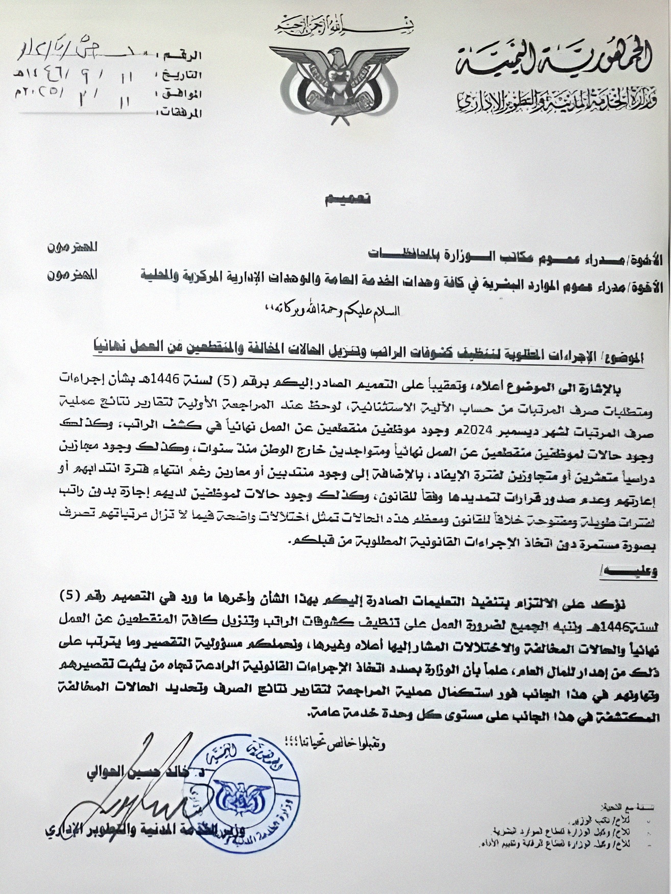ويؤكد التوجيه على ضرورة العمل على تنظيف كشوفات الراتب وتنزيل كافة المنقطعين عن العمل نهائياً والحالات المخالفة والاختلالات المشار إليها.