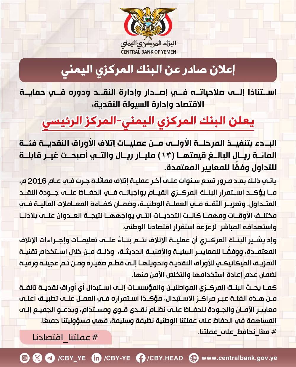 أعلن البنك المركزي بصنعاء البدء بتنفيذ المرحلة الأولى من عمليات إتلاف الأوراق النقدية فئة المائة ريال، البالغ قيمتها (13) مليار ريال، والتي أصبحت غير قابلة للتداول وفقا للمعايير المعتمدة.