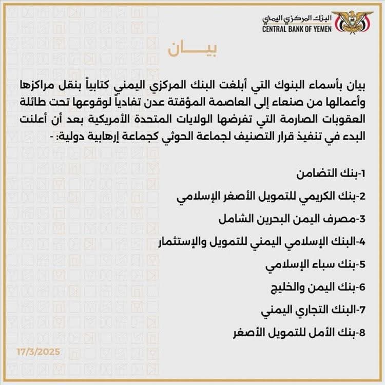 كشف البنك المركزي بعدن عن أسماء البنوك التجارية التي أبلغته بنقل مراكزها وأعمالها من صنعاء إلى العاصمة المؤقتة عدن تفادياً لوقوعها تحت طائلة العقوبات الصارمة التي تفرضها الولايات المتحدة الأمريكية بعد اعلانها البدء في تنفيذ قرار التصنيف لجماعة الحوثي كمنظمة إرهابية دولية.
