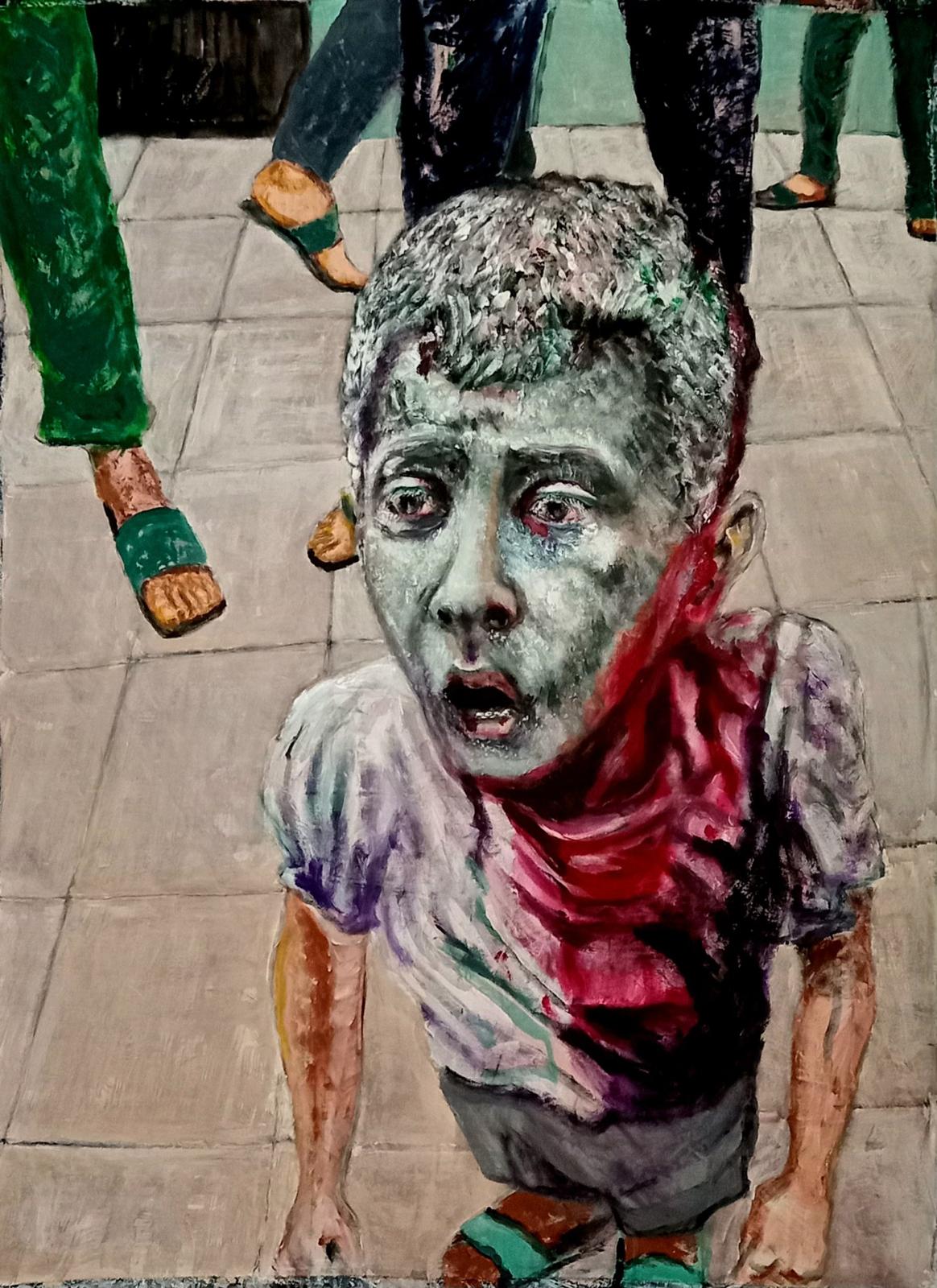 في هذه اللوحة، يرسم براين كارلسون مشهدًا يفلت من حدود اللحظة، كونه يُجسِّد حالة كونية من الذهول والارتباك والحزن الفطري، من خلال وجه طفل فلسطيني مغطى بالغبار والدم، محاط بأرجل الكبار، لكنه وحيد تمامًا في حزنه.