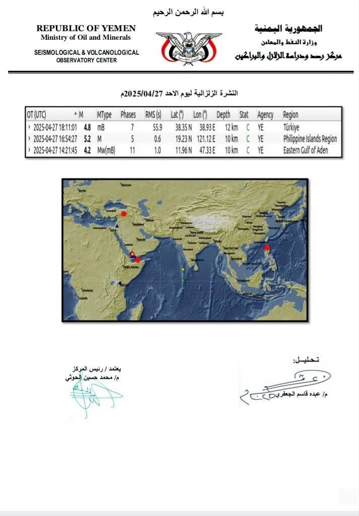 وسجلت هزة أرضية بقوة (4.2) درجة بمقياس ريختر، عند الساعة (5.21) عصرا من خليج عدن.