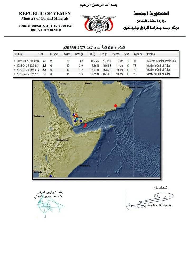 تسجيل 4 هزات أرضية جديدة من خليج عدن