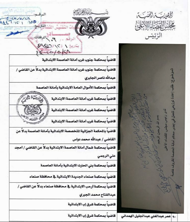 قال القاضي عمر عبد الغني الهمداني إنه تقدّم إلى مجلس القضاء الاعلى بصنعاء بطلب إعادة التوزيع في إحدى محاكم أمانة العاصمة.