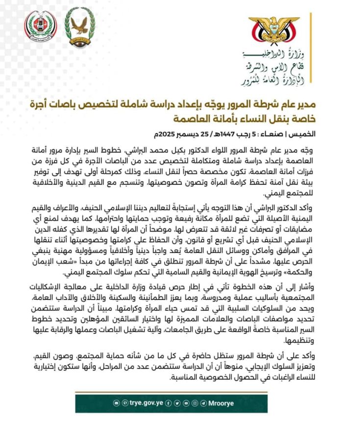 وأوضح البراشي، أن هذه الخطوة تأتي كمرحلة أولى تهدف إلى توفير نقل آمن يحفظ كرامة المرأة ويصون خصوصيتها، وبما ينسجم مع القيم الدينية والأخلاقية للمجتمع اليمني.